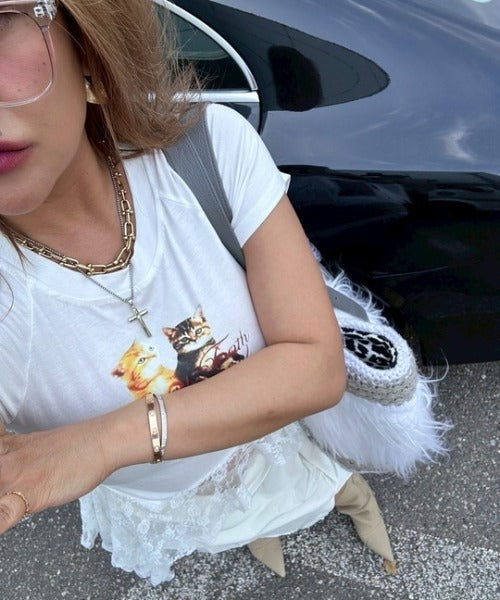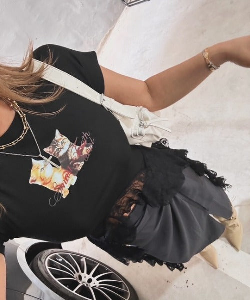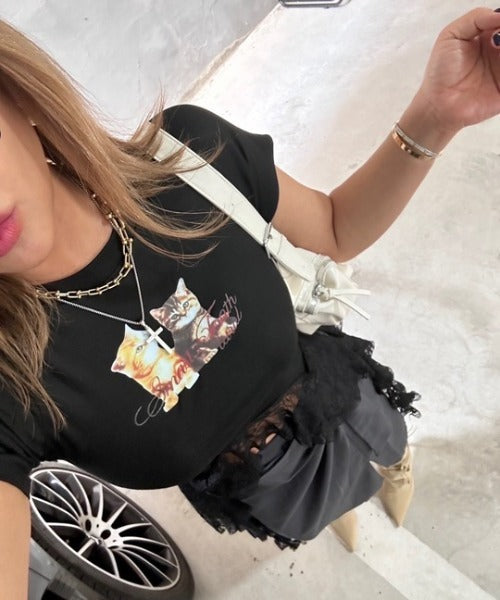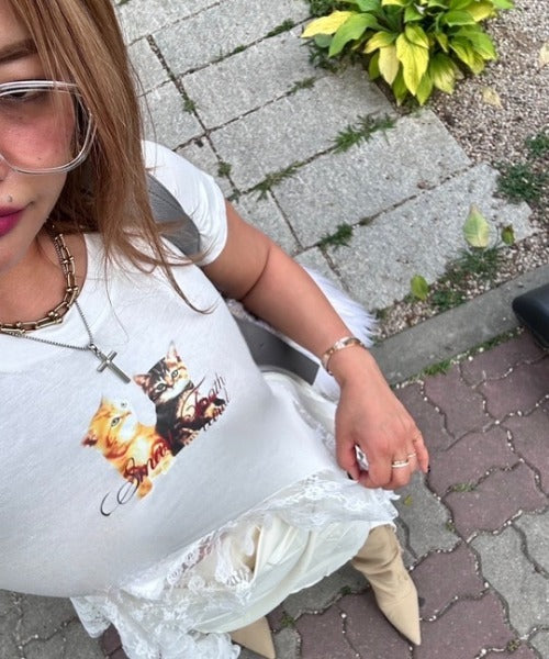ipugo/キャットプリント レースクロップドTEE Tシャツ