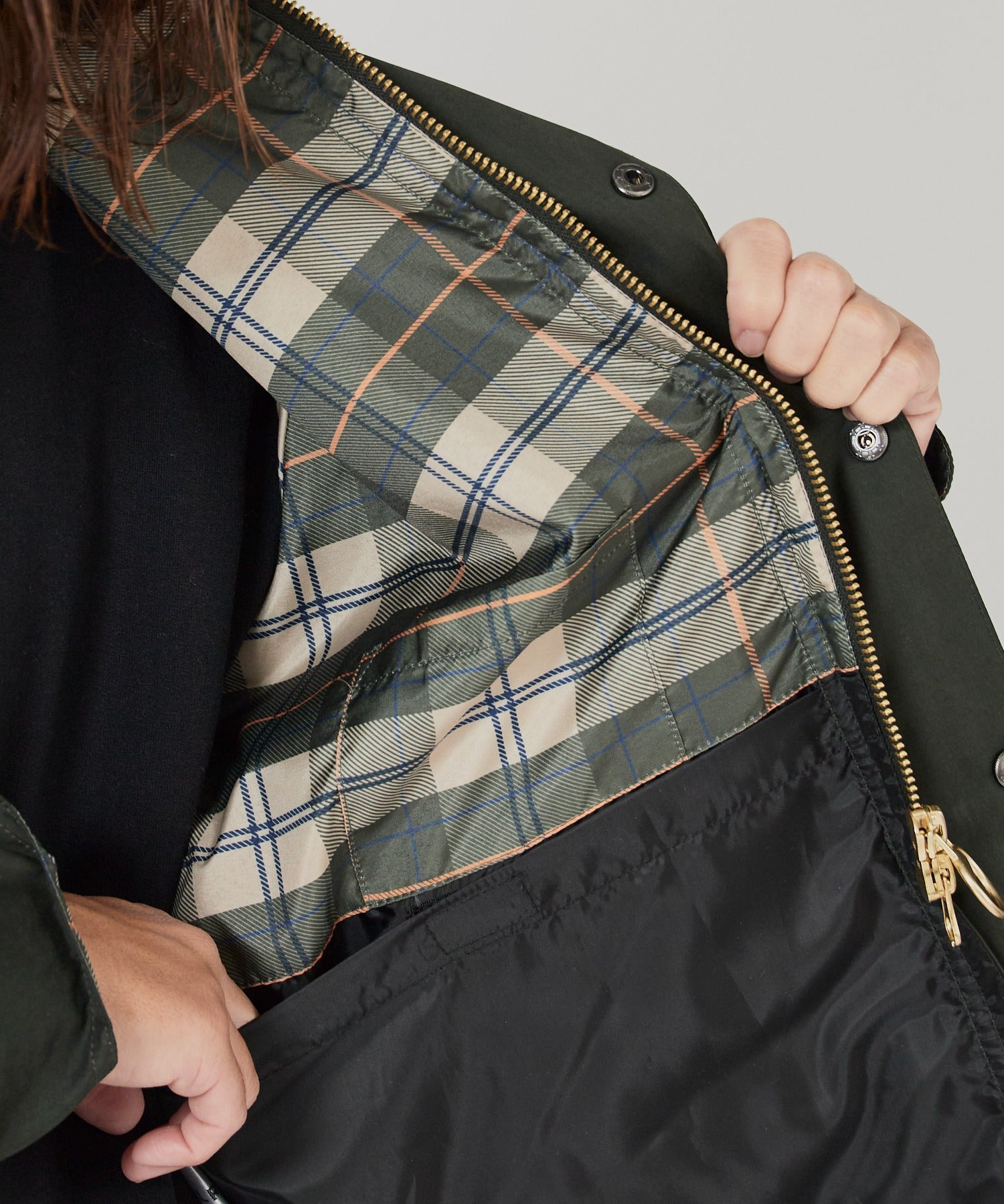 裏地はタータンチェックで、カジュアル感をプラス。
