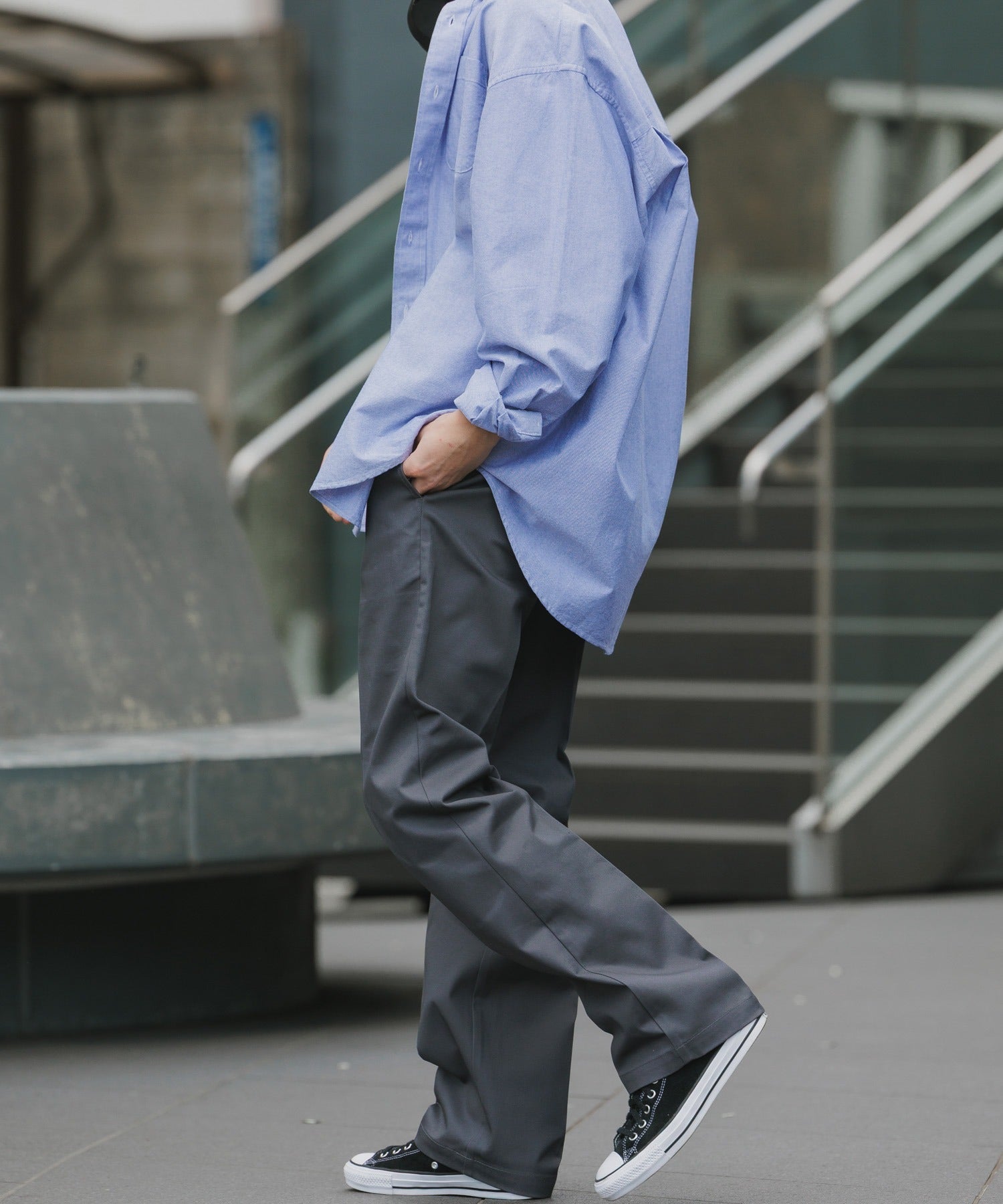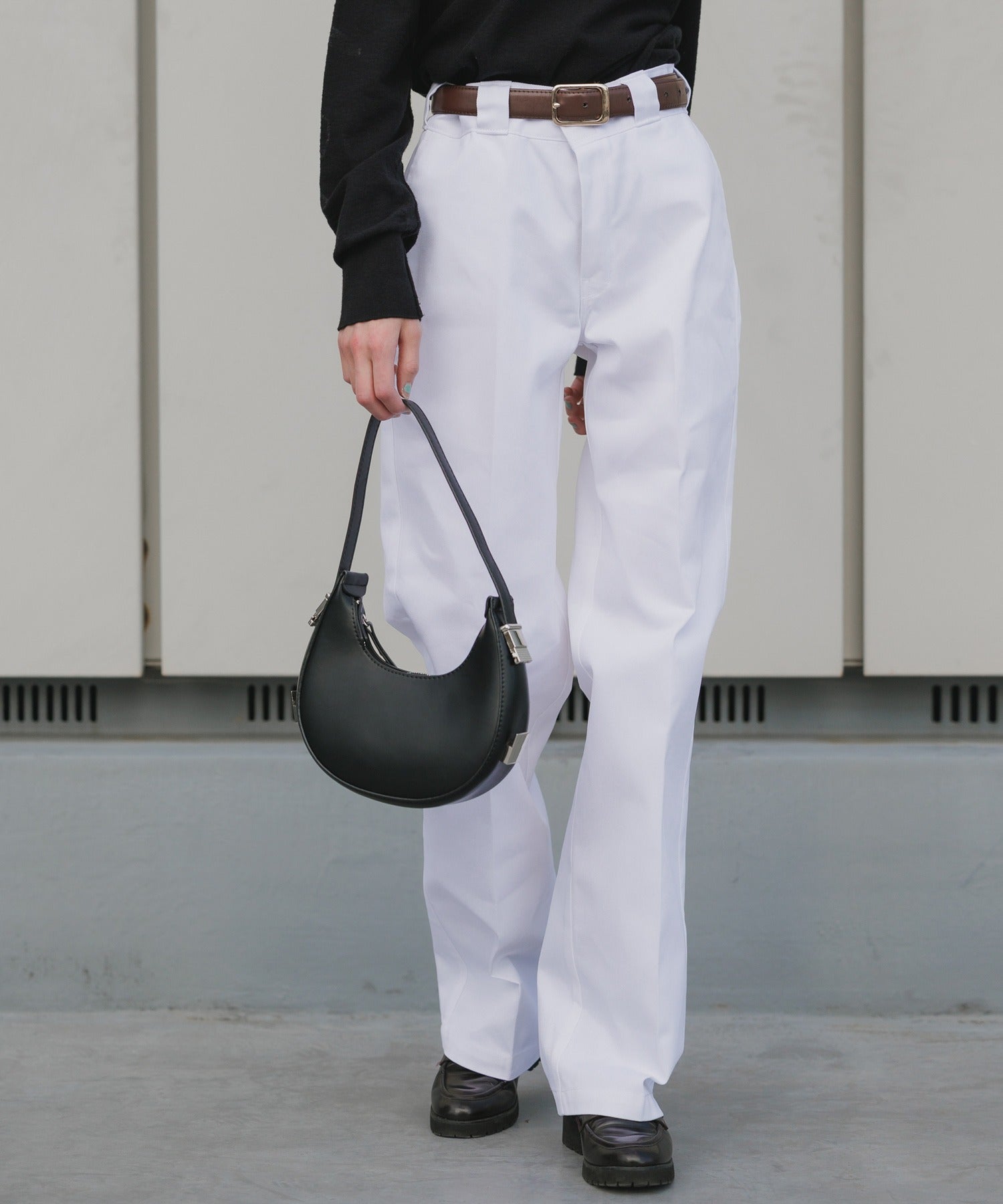 ノープリーツのウエストフロントから、裾まで真っ直ぐ落ちるストレートなシルエットとなっています。