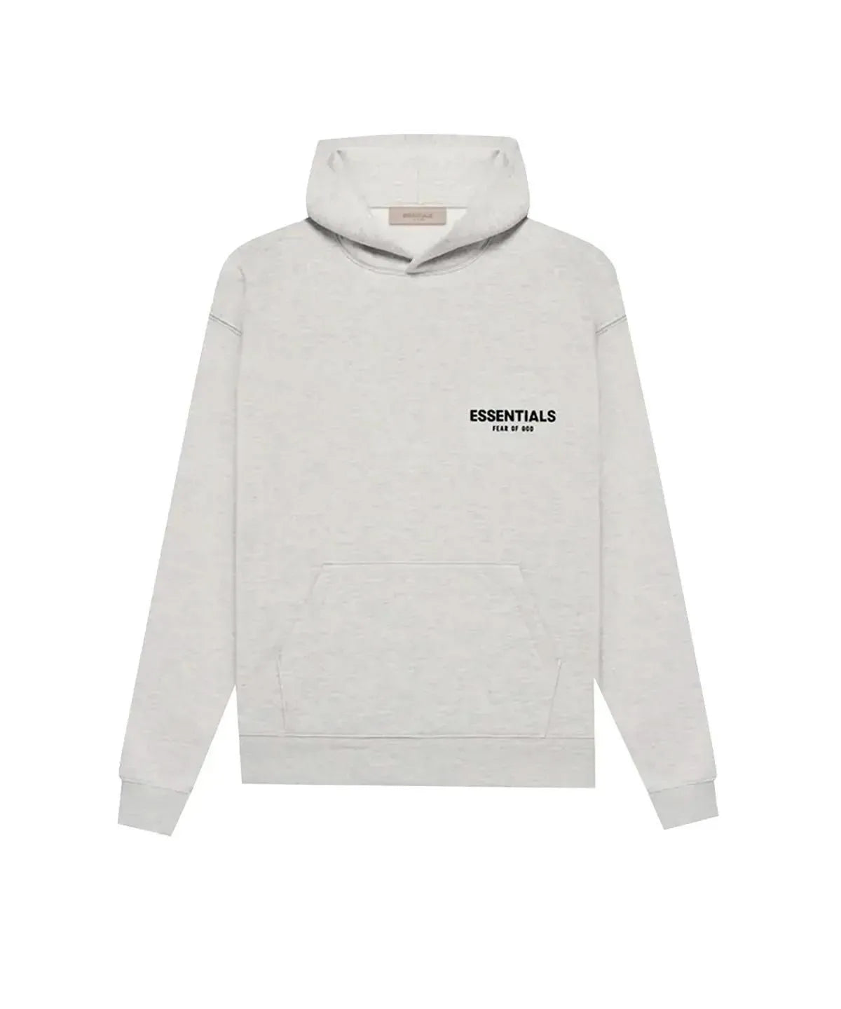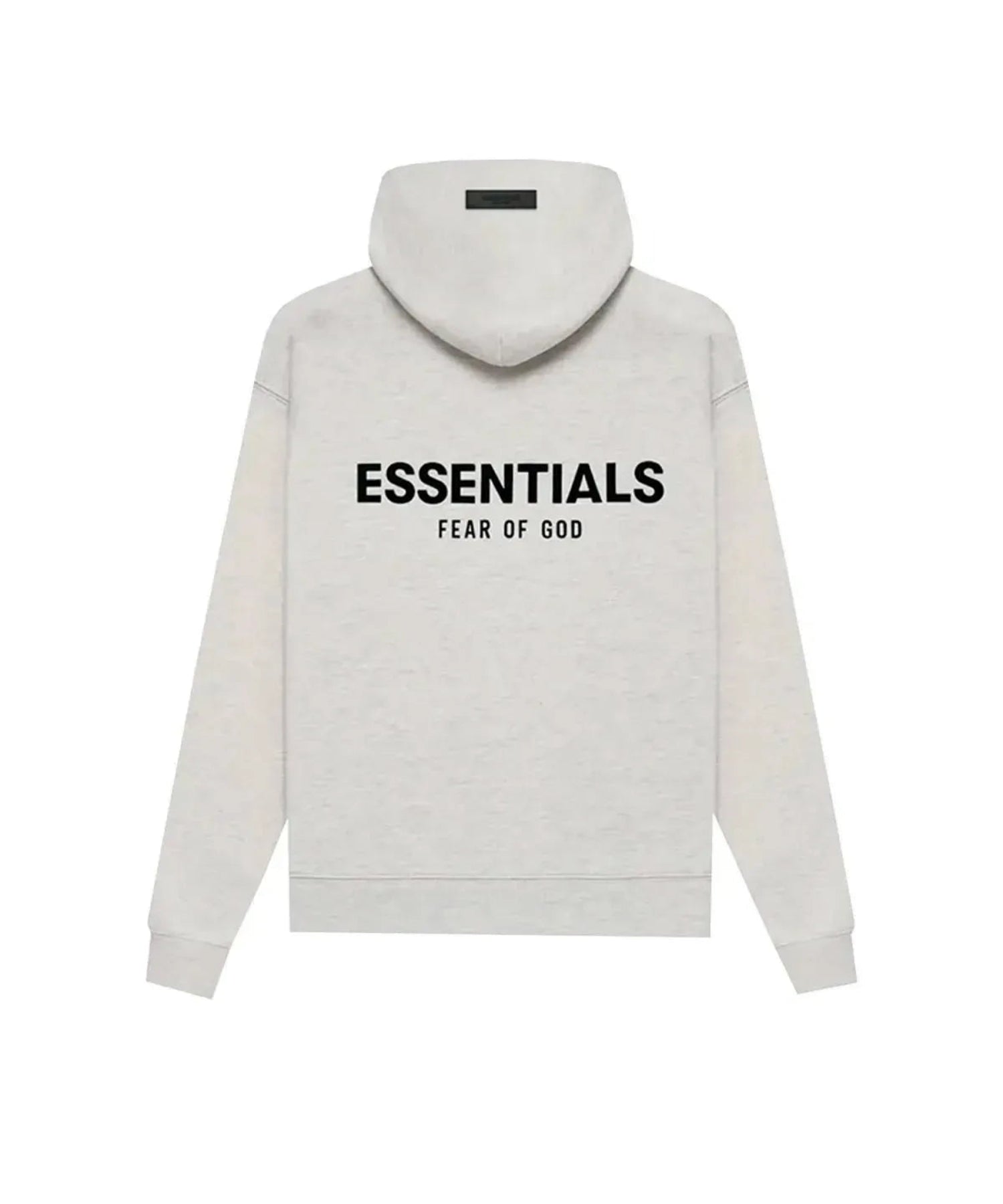 "ESSENTIALS"のロゴが、バックプリントやフロントにプリントされたプルオーバーフーディです。