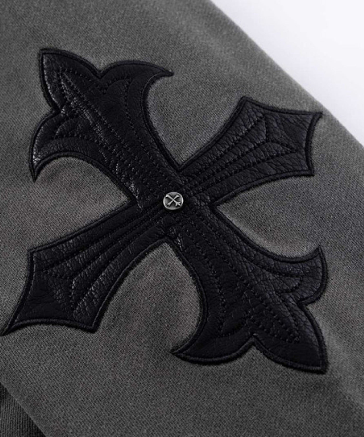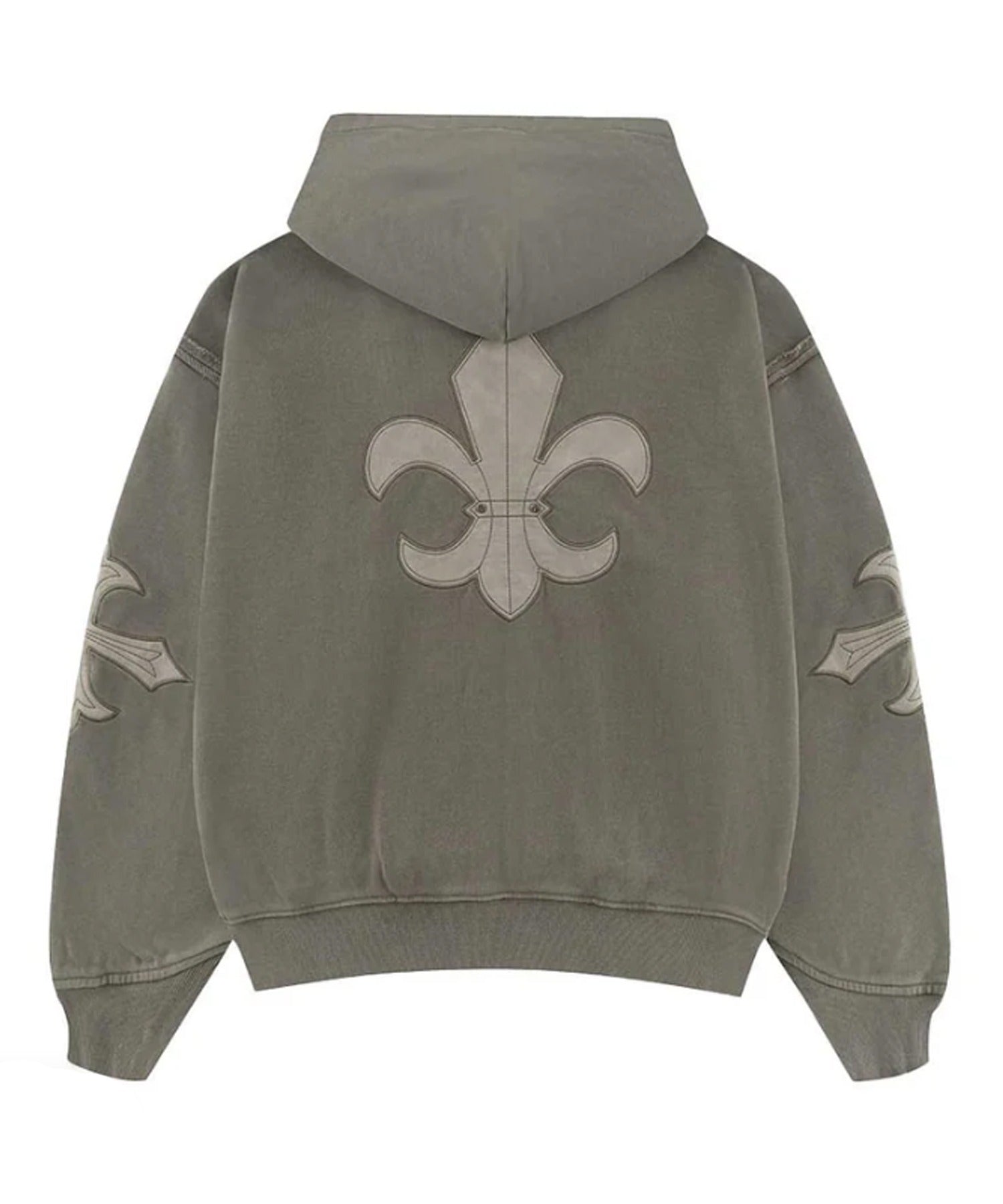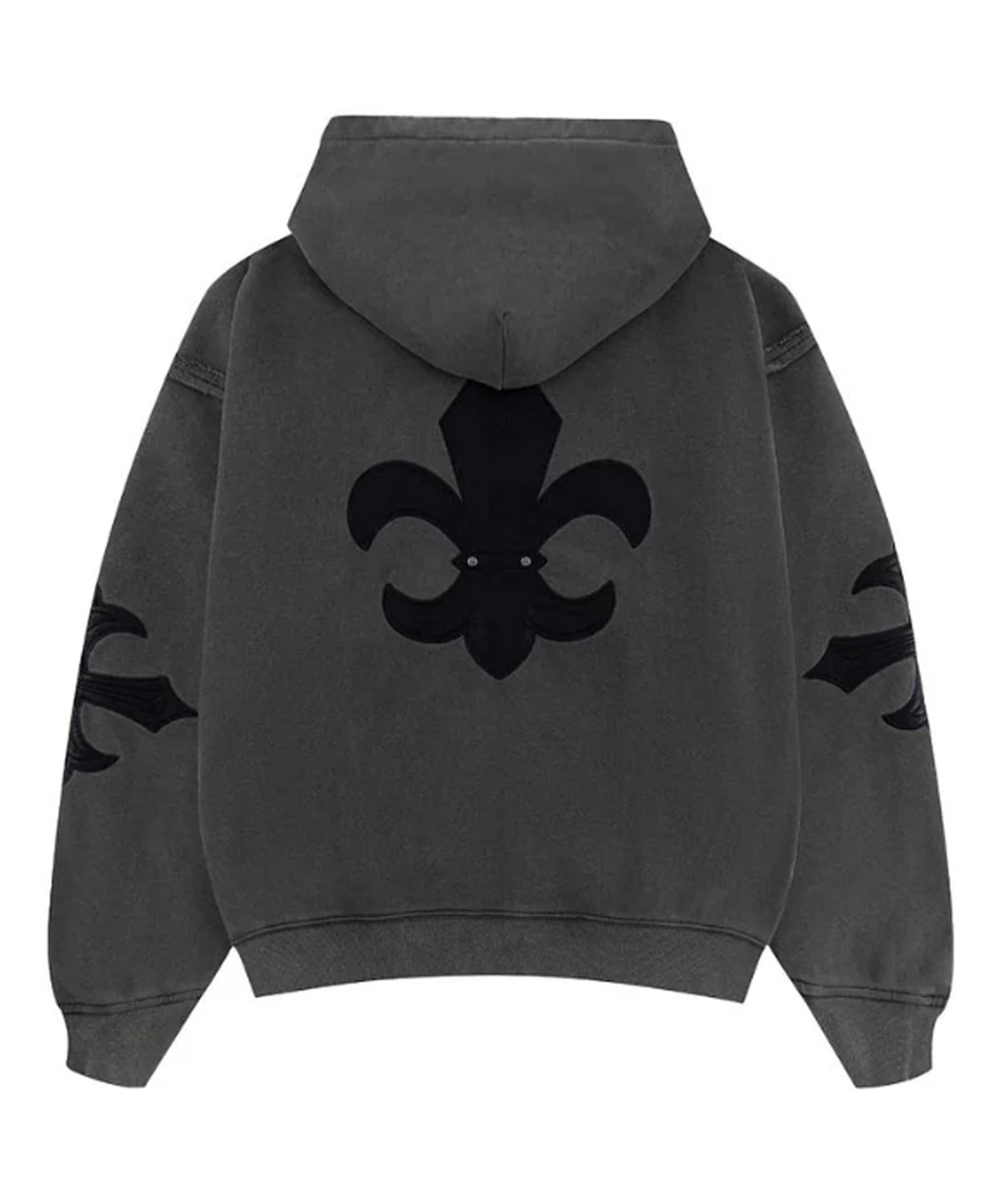 フードとフロントポケットの縁にユリの紋章を象った合皮を刺繍で縫い付け、その上にはクロスデザインのスタッズを配置。