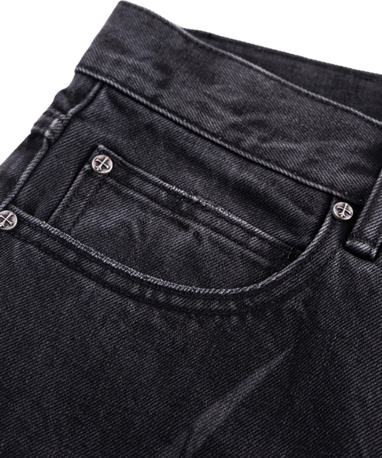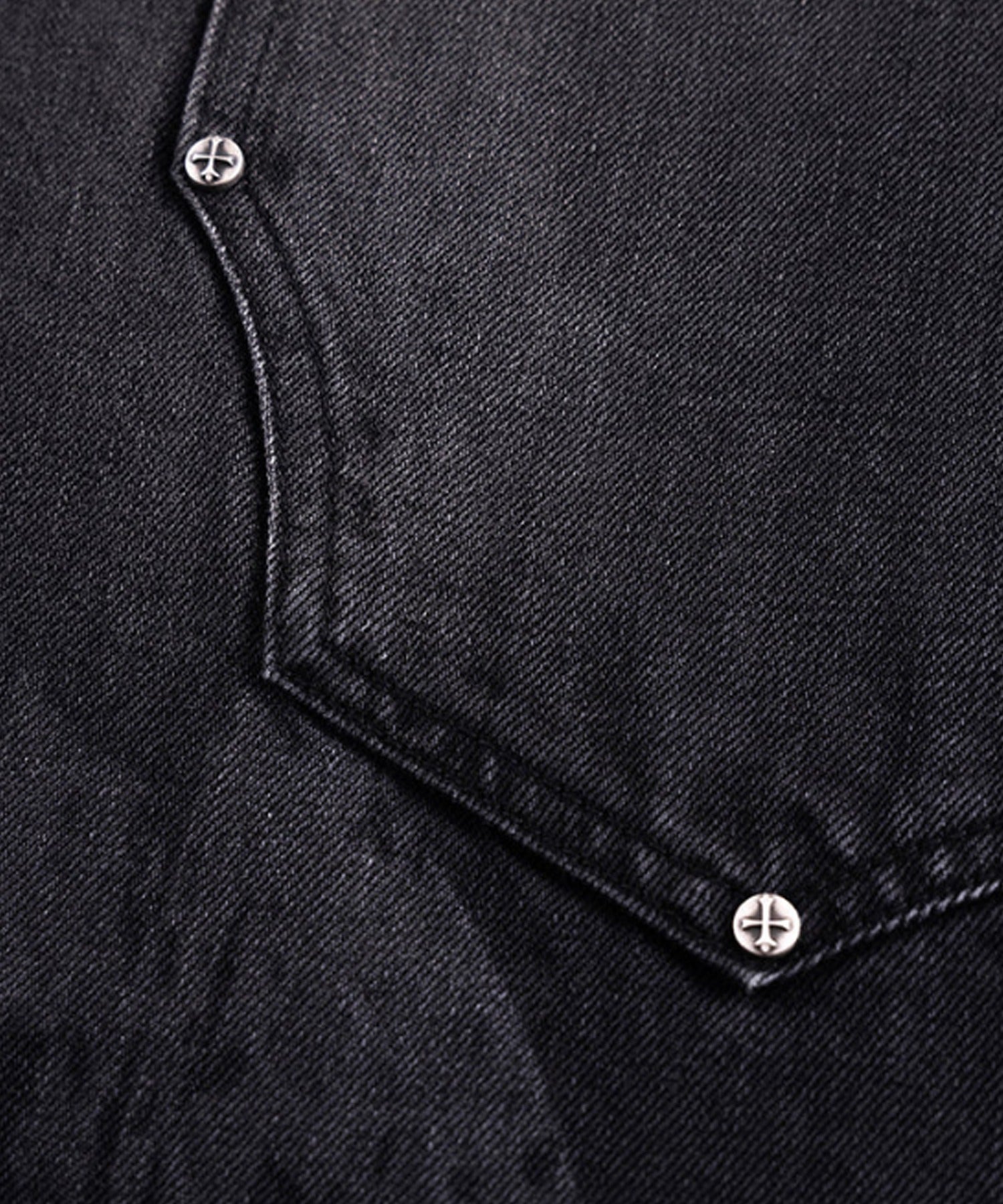 サイドポケットやバックポケット、コインポケットを備えた5ポケットパンツでスタッズを打ち込み、さりげなくクロスのモチーフを表現。