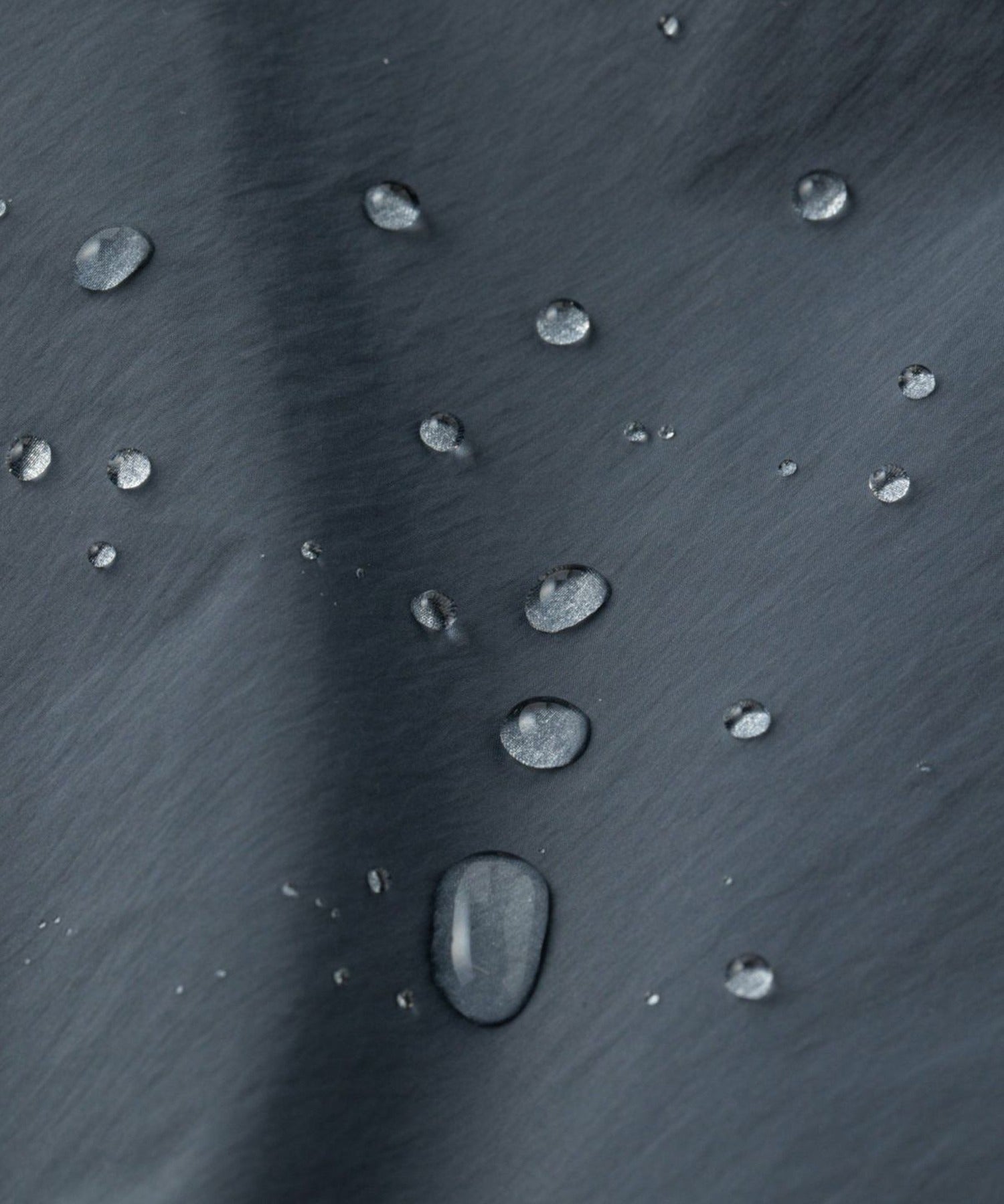 首元の背面には収納可能なフード付きで、スピンドルでサイズ感を調整可能。